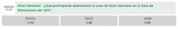 Según el sitio BPlay, la participante que más “paga” es Julieta. Eso quiere decir, que es la que tendría menos chances de irse. En segundo lugar, se ubicó a Nacho con una recompensa de 5 y bastante más alejada, con 1,15 se posicionó a Romina.