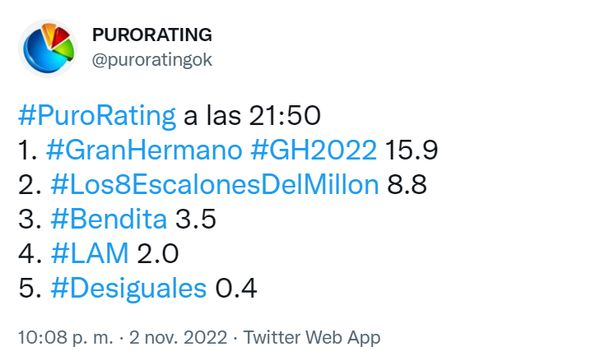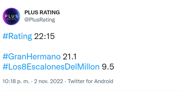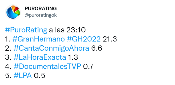 Antes de las 22.30 ya Gran Hermano tocaba el pico de 22 puntos, arrasando con la competencia, que sumados todos los canales no llegaban ni a estar cerca de alcanzarlo.