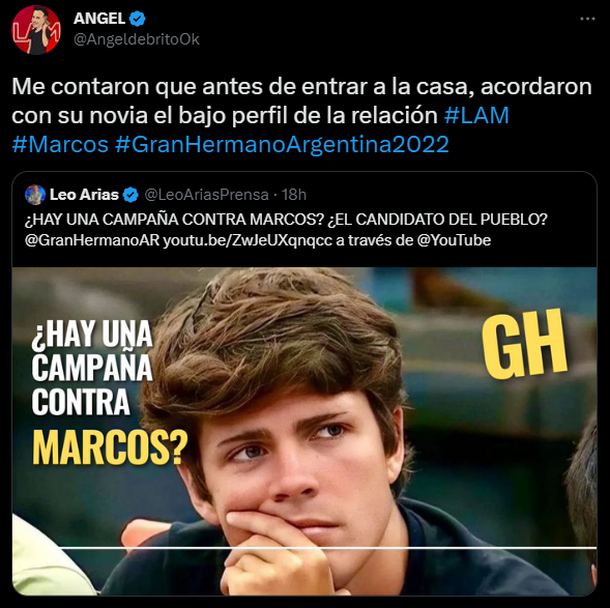 Ángel de Brito contó en la red social Twitter que "antes de entrar a la casa, acordaron con su (¿ex?) novia el bajo perfil de la relación", al comentar un mensaje del periodista Leo Arias, si había una campaña de la producción contra el participante.