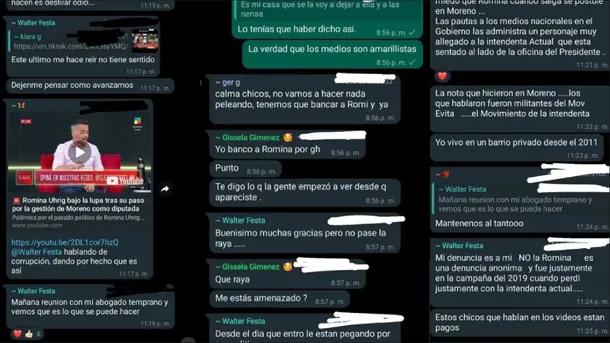 "Y ahí interviene Walter Festa (en el chat) y dice: 'Déjenme pensar cómo avanzamos", siguió De Brito, y señaló que en el grupo, otra persona puso el link de Youtube a una emisión de LAM donde decía: "Romina Uhrig bajo la lupa tras su paso por la gestión de Moreno como diputada".