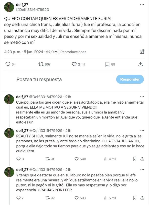 Esta chica también dice que “Furia es un amor de persona" y le deseó lo mejor en el corto camino que queda hacia la final. “Sus alumnos la amaban y respetaban un montón. Quiero que la gente entienda que esto es un reality show. Juli no se maneja así en la vida, no les grita a las personas, no las putea, y ante todo no discrimina. Ella está jugando”, agregó la usuaria, en un testimonio realmente sospechoso.