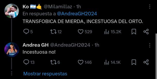 "Transfóbica de m... Incestuosa del or...", dijo otra internauta. "Incestuosa no", volvió a contestar Andrea.