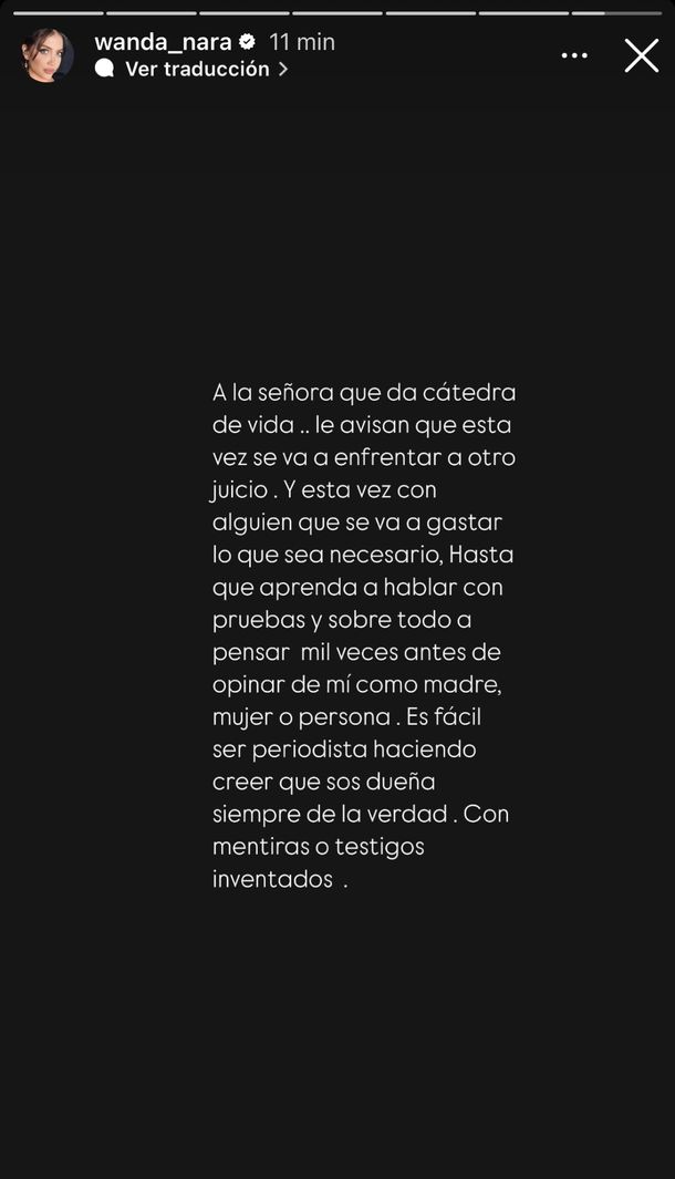 Tras estas declaraciones, Wanda Nara disparó contra la mediática, asegurando que iniciará acciones legales: "A la señora que da cátedra de vida, le avisan que esta vez se va a enfrentar a otro juicio. Y esta vez con alguien que se va a gastar lo que sea necesario", comenzó diciendo.
