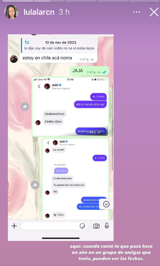 Tras un aluvión de fans enfurecidos por lo revelado por Sol Leguizamón, la joven de nombre "Lula" -amiga de Sol- hizo un fuerte descargo: "Yo siempre fui fan de Duki y le respondía sus historias, como hace cualquier seguidor; jamás pensé que en algún momento iba a ver esos mensajes. Un día, viendo quién había visto mis historias, vi que él había visto una, y me sorprendió. A los dos días, había salido de bailar con mi novio, estábamos volviendo y me llega un mensaje de él cerca de las 6 de la mañana. Me había respondido un mensaje viejo y me puso ‘Gracias’. Al toque le respondí y le puse: “Hola! Te amo", y empezamos a hablar”, contó la joven en diálogo con Minuto Neuquén.