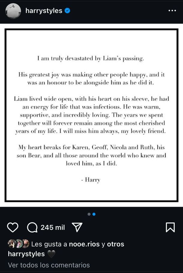 A través de su cuenta de Instagram, Harry Styles compartió una conmovedora imagen de Liam Payne de espaldas, en un recital lleno de fans, y acompañó la foto con una carta que volvió a romper los corazones de todos: "Estoy realmente devastado por la muerte de Liam. Su mayor alegría era hacer felices a otras personas y fue un honor estar a su lado mientras lo hacía", comenzó a escribir.