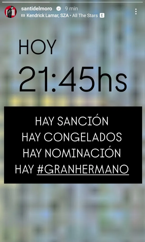 En este sentido, Santiago del Moro lanzó en su cuenta de Instagram un anuncio: "Hoy 21.45, hay sanción, hay Congelados, hay nominación, hay Gran Hermano", lo que generó expectativa entre los seguidores del reality show por el castigo que Catalina pudiera recibir.