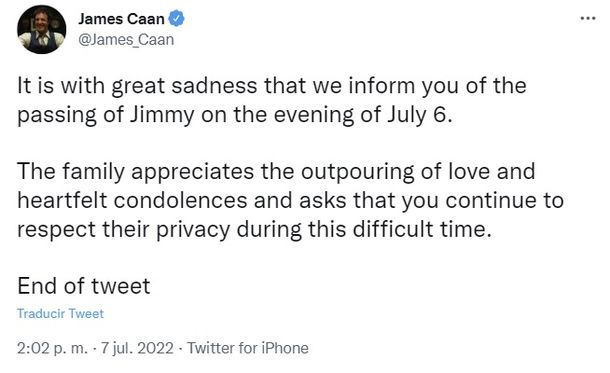 La noticia fue confirmada por sus familiares en la cuenta oficial de James Caan en Twitter, donde agradecieron las expresiones de cariño y las condolencias recibidas tras su muerte, y solicitaron respetar la privacidad de sus allegados.