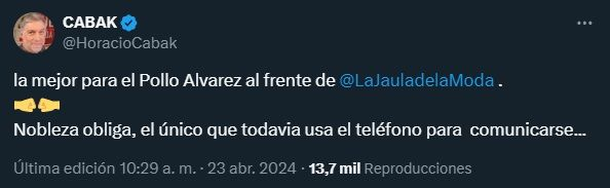 Esto es porque en un acto de buena fe, Horacio Cabak escribió: "Lo mejor para el Pollo Álvarez al frente de La Jaula de la Moda. Nobleza obliga, el único que todavía usa el teléfono para comunicarse". Aunque, por el momento no recibió respuesta de su futuro reemplazante.