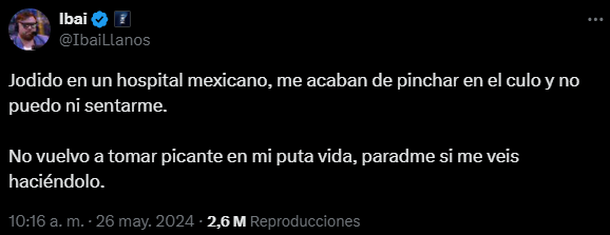 El influencer usó su cuenta de X para dar detalles de mi sucedido, este domingo, que terminó en el centro de salud mexicano: "Jodido en un hospital mexicano, me acaban de pinchar en el culo y no puedo ni sentarme".