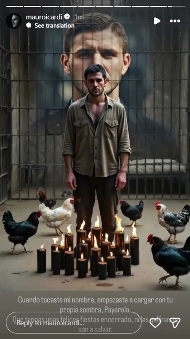 El cierre del descargo llegó acompañado por una imagen generada con inteligencia artificial que sintetizó el clima del mensaje. En la ilustración se observa a un hombre de aspecto descuidado dentro de una celda, rodeado por velas negras encendidas y gallinas, mientras al fondo aparece un retrato de gran tamaño del propio Icardi. La escena, cargada de simbolismo, reforzó la idea de encierro, confrontación y ajuste de cuentas con el pasado.
