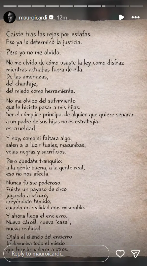 “Caíste tras las rejas por estafas. Eso ya lo determinó la justicia. Pero yo no me olvido. No me olvido de cómo usaste la ley como disfraz mientras actuabas fuera de ella. Las amenazas, el chantaje y el miedo fueron tus herramientas. No me olvido del sufrimiento que le hiciste pasar a mis hijas. Ser el cómplice principal de alguien que quiere separar a un padre de sus hijas no es estrategia: es crueldad. Y hoy, como si faltara algo, salen a la luz rituales, macumbas, velas negras y sacrificios”, escribió, combinando reproches personales con referencias a supuestas prácticas esotéricas.