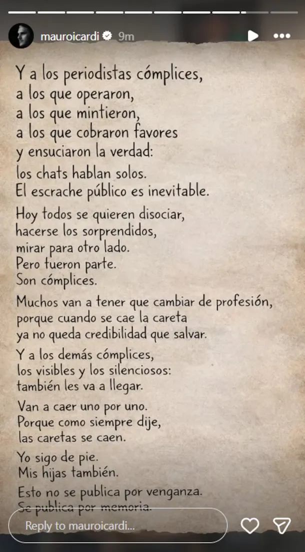 “Y a los periodistas cómplices, a los que operaron, a los que mintieron, a los que cobraron favores y ensuciaron la verdad: los chats hablan solos. El escrache público es inevitable. Hoy todos se quieren disociar, hacerse los sorprendidos, mirar para otro lado. Pero fueron parte. Son cómplices”, lanzó, sin mencionar nombres propios pero con un mensaje directo al ambiente.