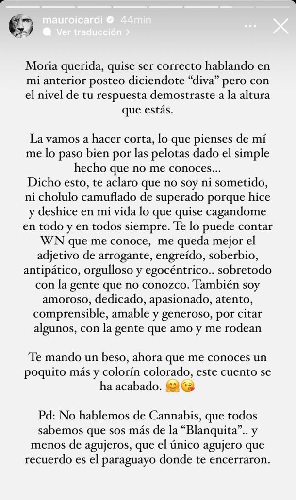 A pesar de estar actualmente en Estambul a miles de kilómetros de la Argentina, Mauro Icardi no tardó en hacer eco de los dichos de la diva y, a través de sus Historias de Instagram, le dedicó una filosa respuesta. “Gracias Moria por tus piropos y halagos. Recibirlos de una persona que es una diva de nuestro país, lo agradezco. También te cuento que el único poncho que me pongo hace 10 años es el mismo. El que elijo cada día y con el que quiero seguir emponchándome durante muchos años de mi vida”, expresó.
