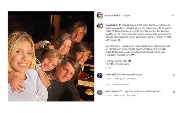 “Querido 2023, te recibo con lo más lindo que tengo en mi vida, Mi Familia. Con una hermosa mujer a mi lado y 5 hermosos niños. Deseo que la vida nos siga dando Salud, Amor, Paz, Felicidad y muchos éxitos. Feliz 2023 para todos, chin”, expuso Icardi, seguido de dos emojis y con mención al usuario de Wanda.