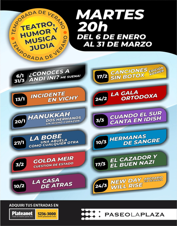 Llega la Segunda Edición del ciclo de “Teatro, humor y música judía” con opciones tan variadas como comedias, stand up, música y obras teatrales profundas, que se presentarán todos los martes de enero, febrero y marzo a las 20 h. en el Paseo La Plaza, Corrientes 1660 (Sala Pablo Picasso). Entradas disponibles en Plateanet
