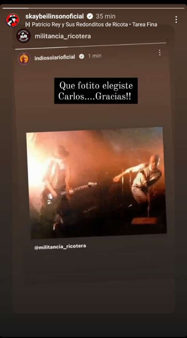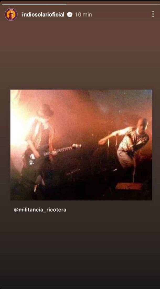 Todo empezó el domingo por la noche cuando Carlos "Indio" Solari compartió en sus historias un posteo de Militancia Ricotera, que se trataba de una foto de él con Skay en algún legendario recital de Los Redondos.