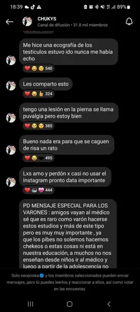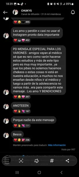 "Mensaje especial para los varones: amigos vayan al médico. Sé que es raro como varón hacerse estos estudios y más de este tipo, pero es muy muy importante, ya que los pibes no solemos hacernos chequeos y esas cosas. ", comenzó diciendo.