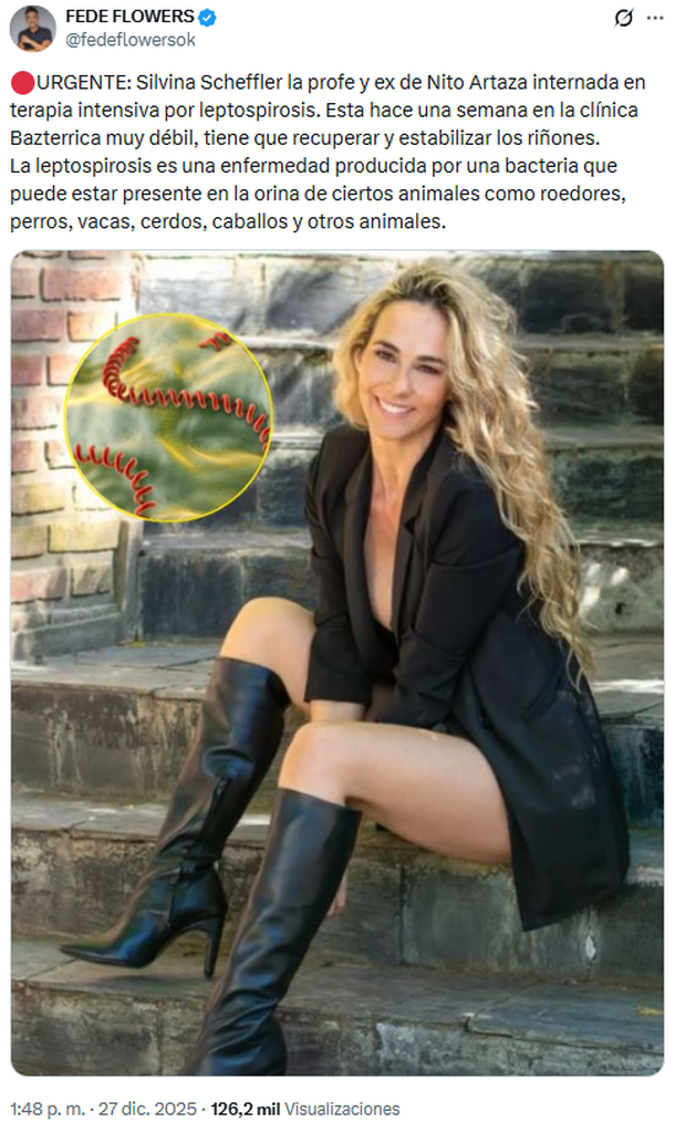 En este sentido, el periodista lanzó el siguiente mensaje, alertando a sus seguidores: "URGENTE: Silvina Scheffler la profe y ex de Nito Artaza internada en terapia intensiva por leptospirosis. Esta hace una semana en la clínica Bazterrica muy débil, tiene que recuperar y estabilizar los riñones".