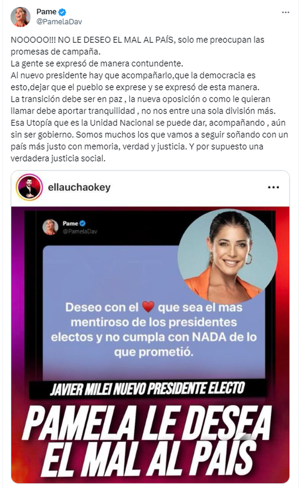 "NOOOOO!!! NO LE DESEO EL MAL AL PAÍS, solo me preocupan las promesas de campaña. La gente se expresó de manera contundente. Al nuevo presidente hay que acompañarlo, que la democracia es esto, dejar que el pueblo se exprese y se expresó de esta manera. La transición debe ser en paz , la nueva oposición o como le quieran llamar debe aportar tranquilidad , no nos entre una sola división más. Esa Utopía que es la Unidad Nacional se puede dar, acompañando , aún sin ser gobierno. Somos muchos los que vamos a seguir soñando con un país más justo con memoria, verdad y justicia. Y por supuesto una verdadera justicia social", explicó ante la mirada atenta de sus miles de seguidores.