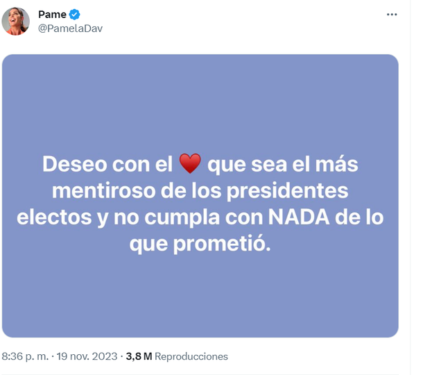 La modelo fue una de las primeras en hablar al respecto y expresó, también en X: "Deseo con el corazón que sea el más mentiroso de los presidentes electos y no cumpla con NADA de lo que prometió". Pero, ante las críticas que recibió sobre este comentario, no tuvo más alternativa que aclarar su pensamiento.