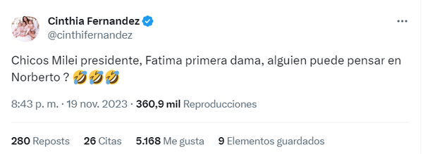 En primera instancia la bailarina habló en broma sobre la novia de Javier Milei. "Chicos Milei presidente, Fátima primera dama, ¿alguien puede pensar en Norberto?", dijo en X haciendo referencia a la ex pareja de Fátima Florez, Norberto Marcos.