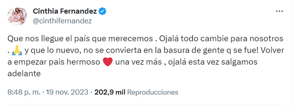 Después de esto, Fernández fue por mucho más seriedad y afirmó: "Que nos llegue el país que merecemos. Ojalá todo cambie para nosotros. ¡Y que lo nuevo no se convierta en la basura de gente que se fue! Volver a empezar, país hermoso una vez más, ojalá esta vez salgamos adelante".