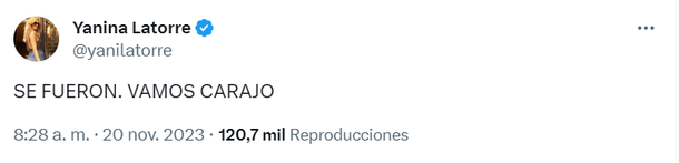 Después de este comentario, a primera hora de la mañana, Latorre afirmó también en X: "SE FUERON. VAMOS C*R*JO" haciendo referencia al kirchnerismo.