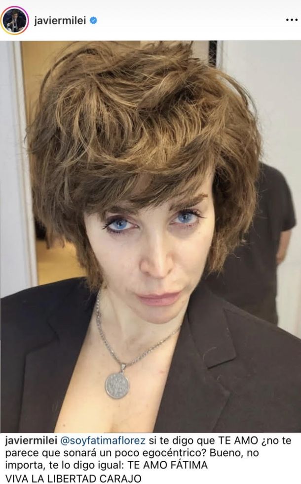 Si hay una pareja que sorprende día a día es la de Fátima Florez y Javier Milei. En esta oportunidad, el candidato a presidente de La Libertad Avanza publicó en su Instagram una foto de su novia caraterizándolo y escribió: “Si te digo que te amo, ¿no te parece que sonará un poco egocéntrico? Bueno, no importa, te lo digo igual. Te amo Fátima. Viva la libertad, carajo”, mostrando su pasión por la mujer que camina a su lado.
