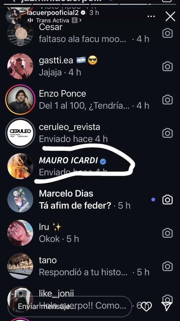 Luego mostró la lista de personas que le escribieron en las últimas horas, en la que figura Icardi. Lo particular es que en el caso del jugador no aparece el dato de cuántas horas hace que le habría escrito y, por eso, muchos piensan que la historia es apócrifa.