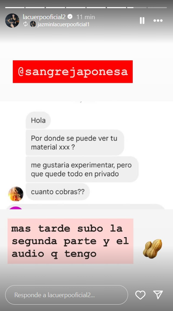 Como si fuera una serie por entregas, La Cuerpo prometió que esto recién comienza.“Más tarde subo la segunda parte y el audio que tengo”, escribió en una historia, acompañando el mensaje con un emoji de maní, dejando entrever que aún queda contenido por revelar.