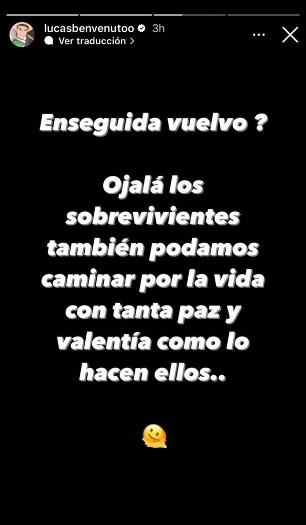 Mediante las historias de Instagram de su perfil oficial, Lucas Benvenuto hizo referencia a la llegada de Jey Mammon al teatro y escribió: "¿Enseguida vuelvo? Ojalá los sobrevivientes también podamos caminar por la vida con tanta paz y valentía como lo hacen ellos".