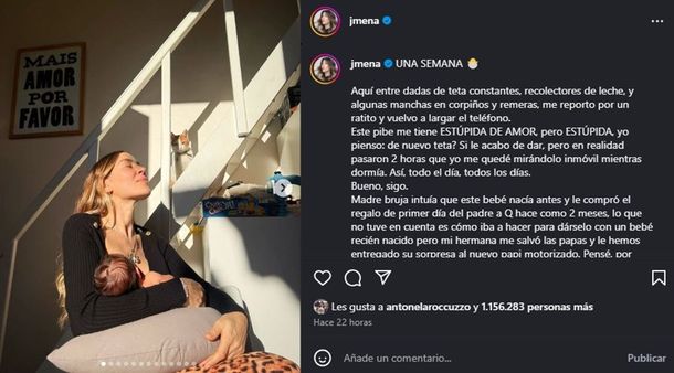Bajo el título "Una semana" y acompañado del clasíco emoji de un pollito saliendo del cascarón que se utiliza en esta ocasión, Jimena abrió su corazón con una dulce dedicatoria para su bebé: "Aquí entre dadas de teta constantes, recolectores de leche, y algunas manchas en corpiños y remeras, me reporto por un ratito y vuelvo a largar el teléfono. Este pibe me tiene ESTÚPIDA DE AMOR, pero ESTÚPIDA, yo pienso: ¿De nuevo teta? Si le acabo de dar, pero en realidad pasaron 2 horas que yo me quedé mirándolo inmóvil mientras dormía. Así, todo el día, todos los días."