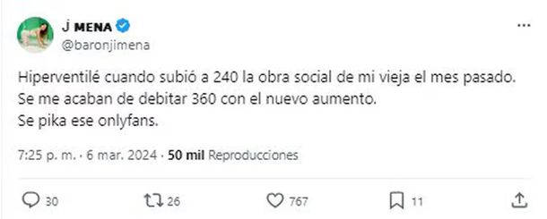 “Hiperventilé cuando subió a 240 la obra social de mi vieja el mes pasado. Se me acaban de debitar 360 con el nuevo aumento”, escribió indignada en la red social X. “Se pika ese OnlyFans”, dijo haciendo referencia a la forma en la que podría enfrentar el gasto.