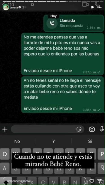 Luego, sumó: “Ah, no tenés señal, no te llega el mensaje. Estás culiando con otra. Qué asco, te voy a matar, bebé reno. No sabés dónde te metiste. Enviado desde mi iPhone”.