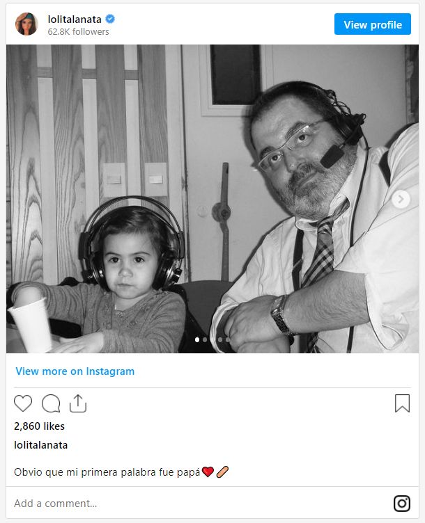 “Obvio que mi primera palabra fue papá”, escribió Lola, de 20 años, junto a una foto en blanco y negro. En la imagen, se la ve junto a Jorge Lanata en un estudio de radio. También se puede ver un video en el que el conductor de Periodismo para todos le da algunos consejos para estar segura en su casa.