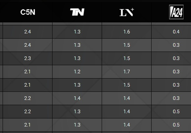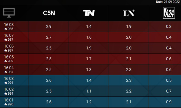 Pero más tarde, con picos de más de 3 puntos, C5N pasó a estar en la línea de los canales de aire, superando a El Nueve y América TV, quedando por debajo de El Trece.