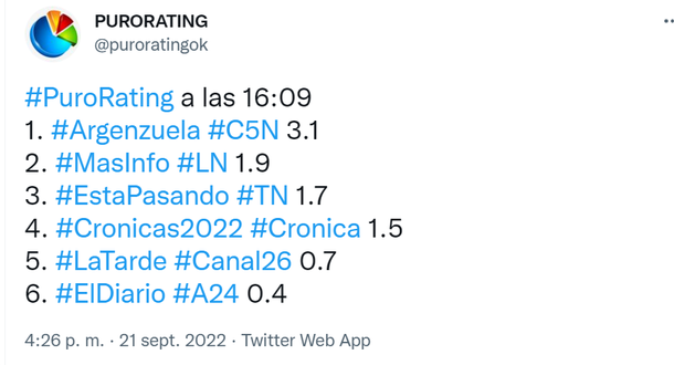 Jorge Rial con su Argenzuela, por C5N, tuvo otra gran tarde a nivel programa, porque tuvo todo para informar y entretener, y también a nivel rating, donde sigue liderando entre las señales de noticias.
