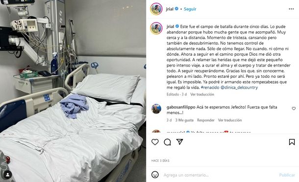 Además, se mostró esperanzado sobre su salud: "Ahora a seguir en el camino porque Dios me dio otra oportunidad. A relamer las heridas que me dejó este pequeño pero intenso viaje, a curar el alma y el cuerpo y tratar de entender todo. Gracias los que, sin conocerme, pelearon a mi lado", publicó Rial en su cuenta de Instagram.