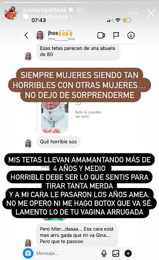 La hija de Reina Reech y Nicolás Repetto parece haber perdido la paciencia y le respondió con mordacidad: “Mis tetas llevan amamantando más de 4 años y medio… Horrible debe ser lo que sentís para tirar tanta mierda…Y, a mi cara le pasaron los años, amiga, no me opero ni me hago botox, que va ser… Lamento lo de tu vagina arrugada”.