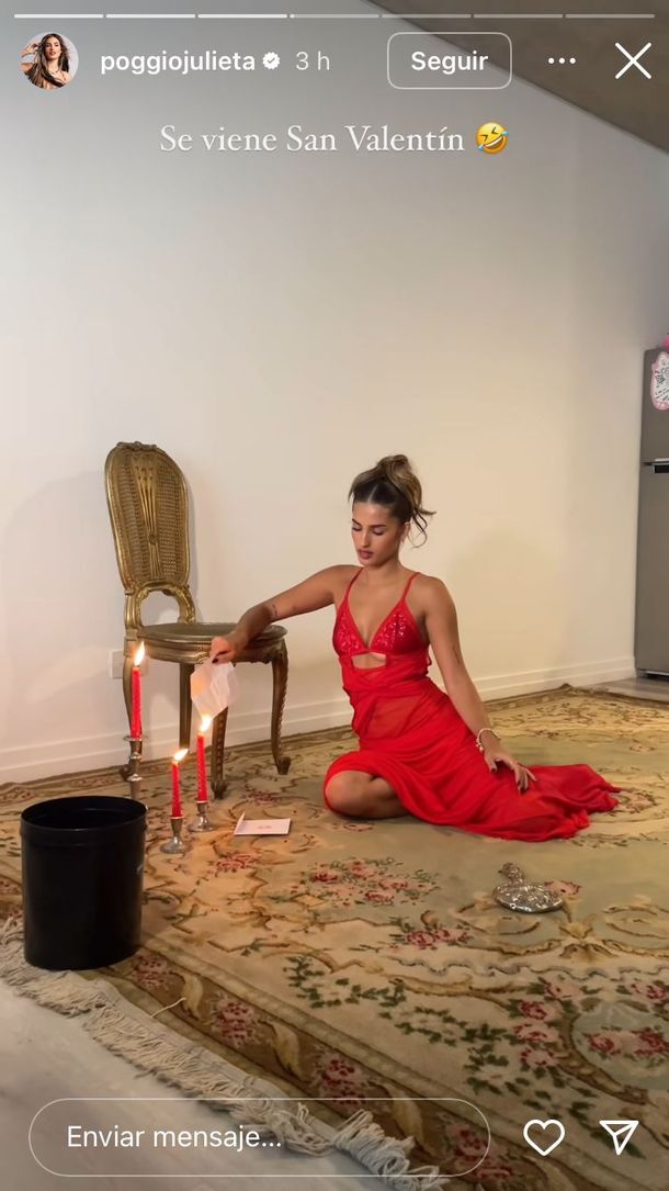 Con un vestido rojo y apoyada en el suelo, la influencer sostenía una carta que comenzaba a arder por el fuego, pero la situación se le fue de las manos y casi se prende fuego el set fotográfico. De hecho, asustada por la situación, Poggio lanzó la carta encendida a un balde y todos los que estaban allí comenzaron a reírse, mientras también intentaban "apagar" el momento.