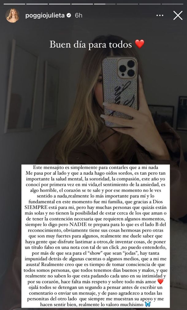 Tras el intento de suicidio de Maxi Giudici, Julieta Poggio publicó una historia en Instagram reflexionando sobre lo que sintió tras la salida de Gran Hermano y lo que es enfrentarse con el mundo de la fama de buenas a primeras.