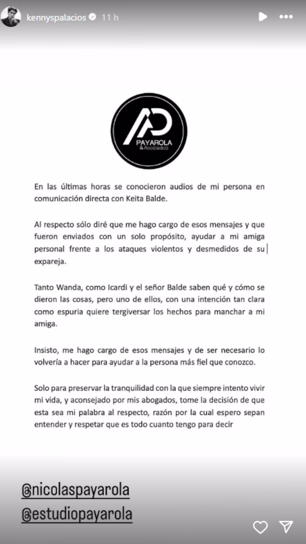 En un comunicado, Palacios admitió la autenticidad de los audios y aseguró que su intención era proteger a Wanda en medio del conflicto con Icardi. "Fueron enviados con un solo propósito, ayudar a mi amiga personal frente a los ataques violentos y desmedidos de su expareja", afirmó.