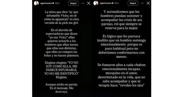 El cierre de su texto no pasó desapercibido y apuntó directamente a la falta de empatía afectiva presente en numerosas experiencias sentimentales. Aguirre remarcó una situación que considera histórica y agotadora: “Se fumaron años a tipos incapaces de acompañar, mezquinos en el amor y que ni terapia hacen”, dejando en evidencia que, detrás de la discusión sobre Vicky, se esconde una crítica más amplia a los vínculos contemporáneos y a los modelos de género que todavía siguen vigentes.