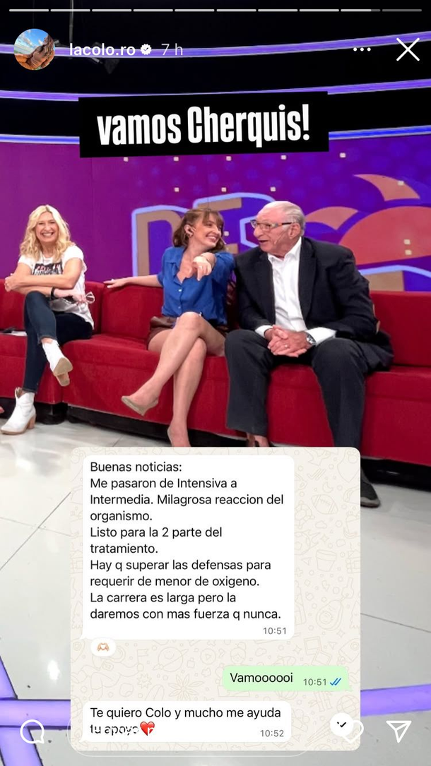 Sin embargo, ha habido buenas noticias en relación a la situación del comunicador: de acuerdo a una publicación en Instagram de la experta en economía, Rosalía Constantino (C5N), Cherquis presentó mejorías. Así lo expresaba él mismo en diálogo por WhatsApp con la también periodista: "Buenas noticias: me pasaron de intensiva a intermedia (terapia). Milagrosa reacción del organismo", comenzó escribiendo Bialo.