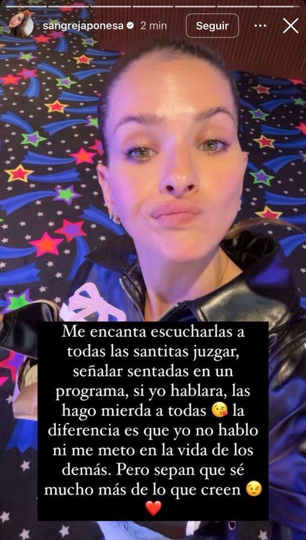 "Me encanta escucharlas a todas las santitas juzgar, señalar sentadas en un programa, si yo hablara las hago mierda a todas", ironizó la China Suárez, sin dar nombres pero dando la cara en sus historias de Instagram.