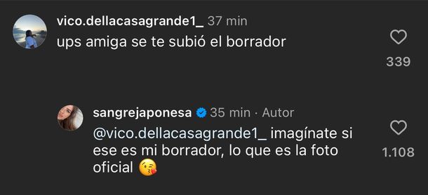 "Ups, amiga, se te subió el borrador", le señaló una seguidora con picardía en referencia al gesto que la actriz mostró en su imagen, a lo que Suárez subió la apuesta: "imaginate si ese es mi borrador, lo que es la foto oficial".