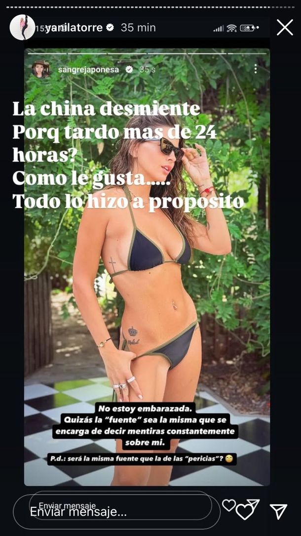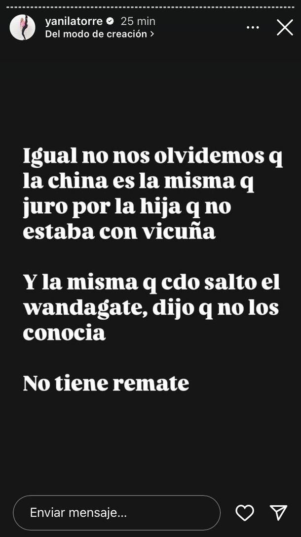 Rápidamente, Yanina Latorre se hizo cargo de las palabras de la actriz y salió a contraatacar: "La China desmiente. ¿Por qué tardó más de 24 horas? Cómo le gusta... todo lo hizo a propósito", señaló la mediática, con la historia que la pareja de Mauro Icardi había compartido momentos antes.