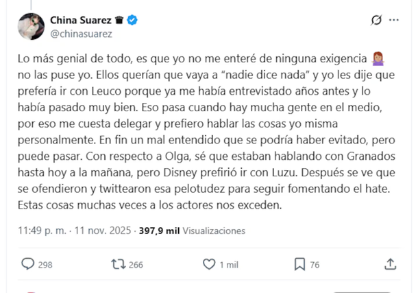 Además, Suárez aprovechó para aclarar otro rumor vinculado con el canal Olga, el otro espacio de streaming que la habría contactado: “Sé que estaban hablando con Migue Granados hasta hoy a la mañana, pero Disney prefirió ir con Luzu. Después se ve que se ofendieron y tuitearon esa pelotudez para seguir fomentando el hate”.