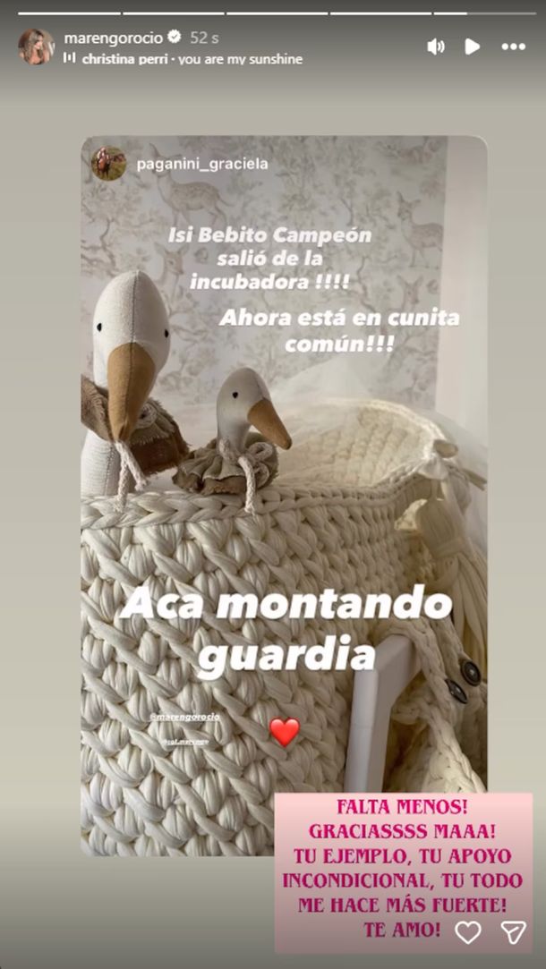 La noticia fue acompañada por un mensaje cargado de emoción, que Marengo decidió replicar en su perfil: “¡Isi bebito campeón salió de la incubadora! Ahora está en cunita común. Acá montando guardia”, escribió su madre en una historia.