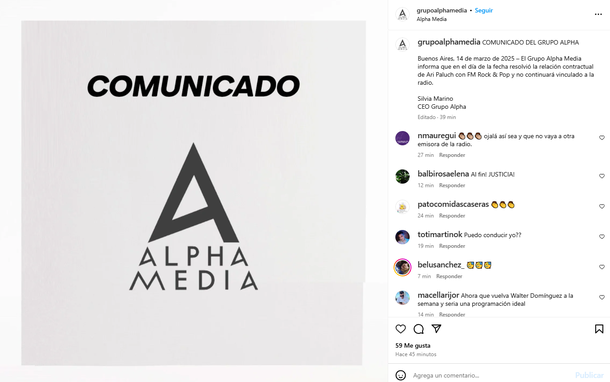 En un breve mensaje, la empresa informó: “El Grupo Alpha Media informa que en el día de la fecha resolvió la relación contractual de Ari Paluch con FM Rock & Pop y no continuará vinculado a la radio. Silvia Marino - CEO Grupo Alpha”.
